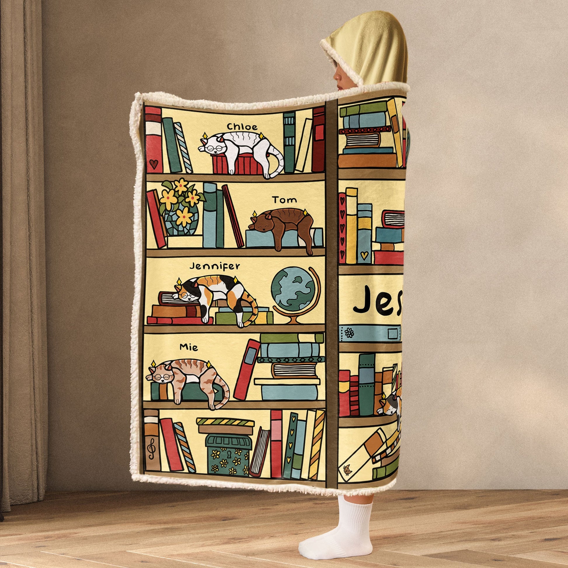 This cozy, personalized hooded blanket features a unique bookshelf design filled with playful cats, books, and fun elements that make it a perfect gift for cat lovers and bookworms alike. Each shelf highlights individual cats resting on books or playfully interacting with their surroundings, adding a charming touch to the overall design.