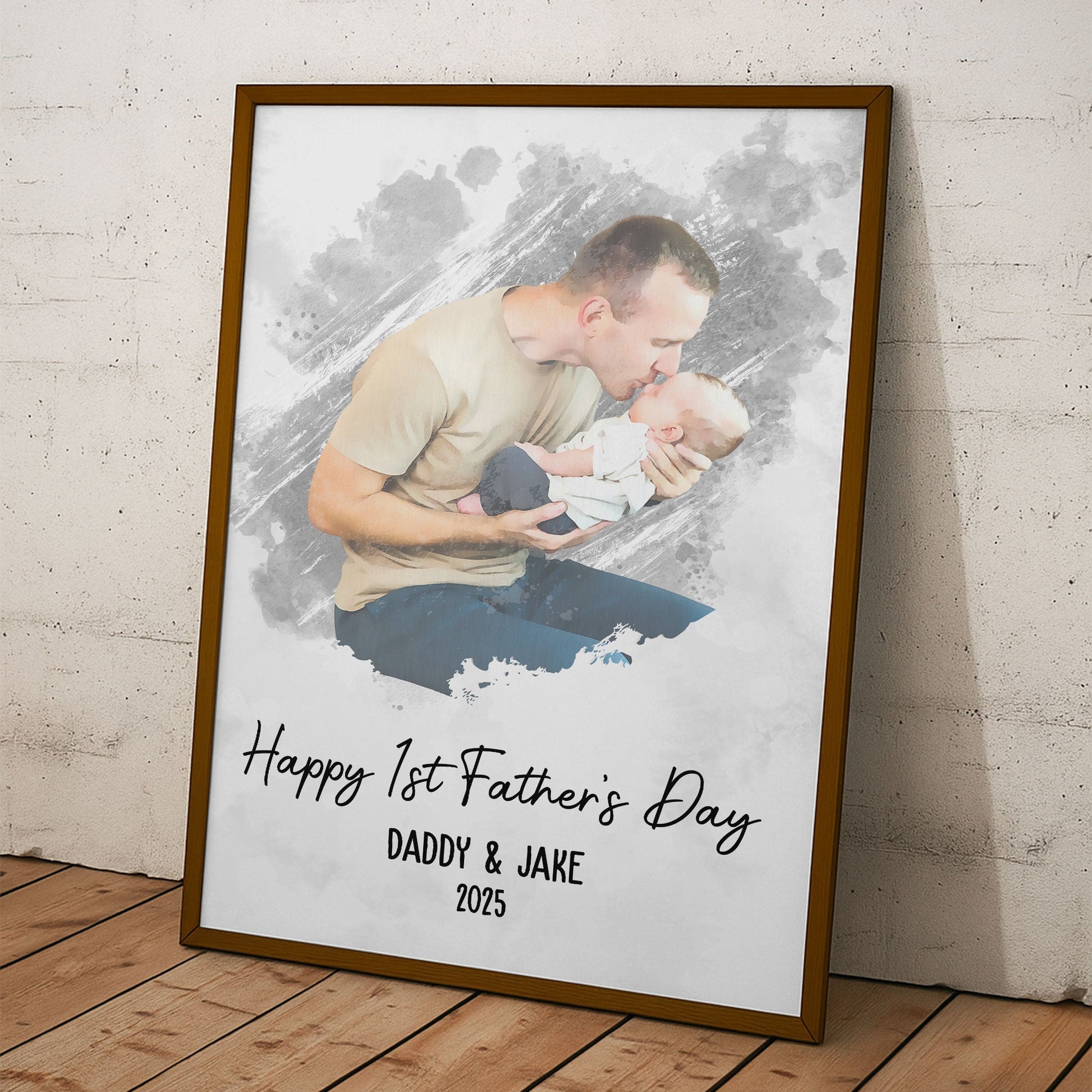 Designed for family men who cherish every special moment, our Watercolor Style Happy 1st Father's Day Personalized Photo Poster is an awe-inspiring gift to commemorate a dad's first Father's Day and the birth of a newborn. This beautifully crafted poster encapsulates the essence of fatherhood and unforgettable family memories by allowing the inclusion of a treasured photo, making it an extra special piece of wall art.