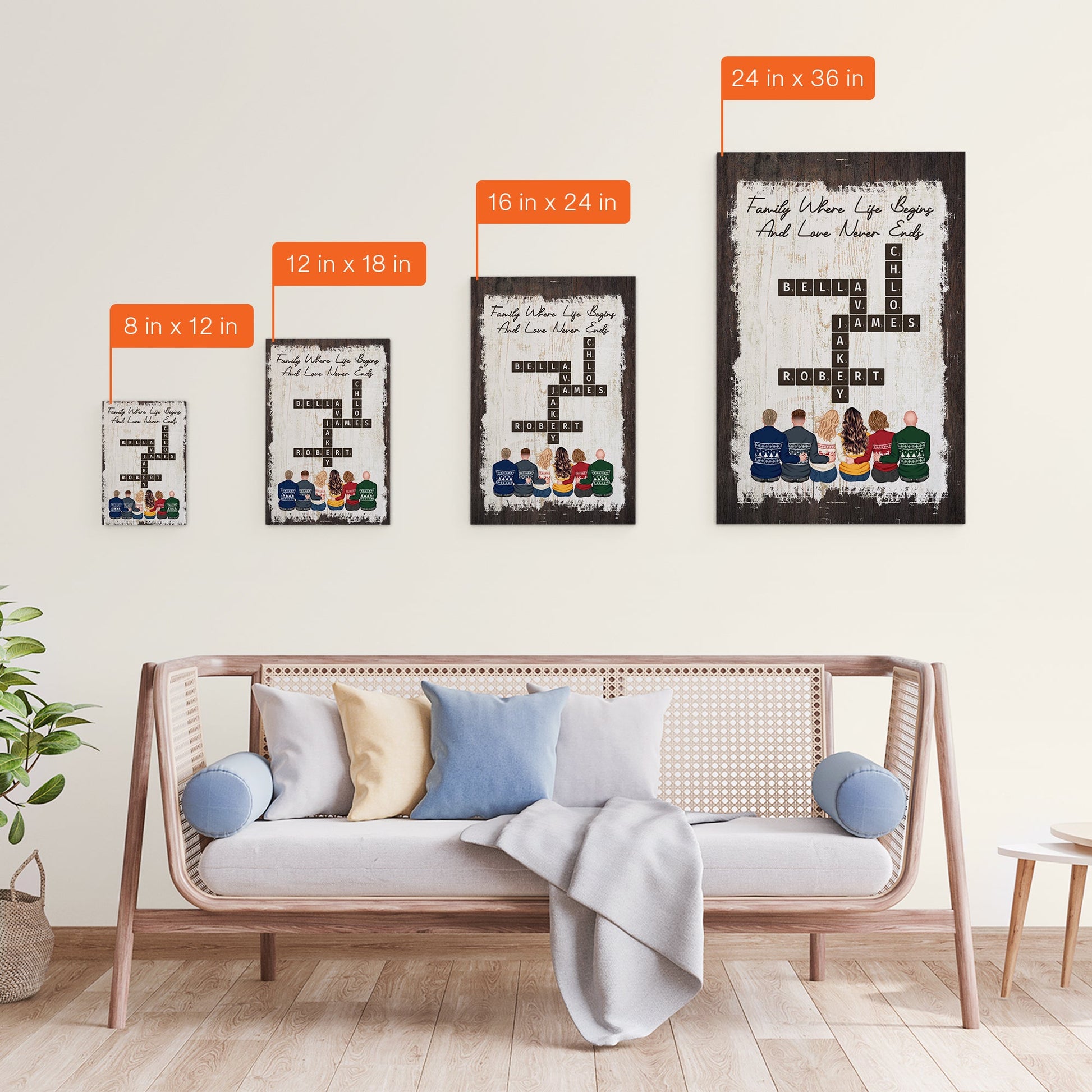 Create a heartfelt tribute to family with our Personalized Wrapped Canvas! This beautiful piece allows you to customize characters representing your family members, along with their names arranged like a Scrabble game, adding a playful and sentimental touch to your home decor. Perfect for dad, mom, grandparents, siblings, or sisters, this canvas is a charming reminder of the special bonds you share.